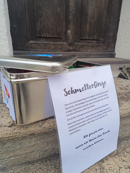 Zwei Jungen hatten den Wunsch, fremden Menschen eine Freude zu machen. Mit viel Geduld und Hingabe bastelten sie filigrane Schmetterlinge aus zartem Seidenpapier. Jeder einzelne trug einen aufmunternden Spruch – leise Botschaften der Hoffnung, des Lächelns und der Zuversicht. Behutsam legten sie die Schmetterlinge in eine Box vor unserem Schulhaus.